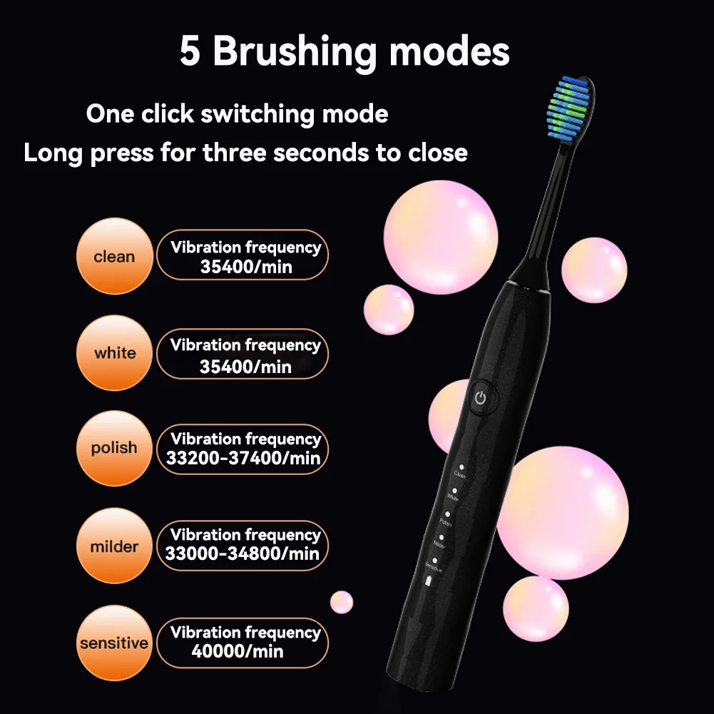 Description:4 Colors Sonic electric toothbrush for Adult Rechargeable with 2 Replacement Brush Heads 5 Modes and 3 Intensity with 2-Minute Intelligent Timer and IPX 70 Waterproof Technology